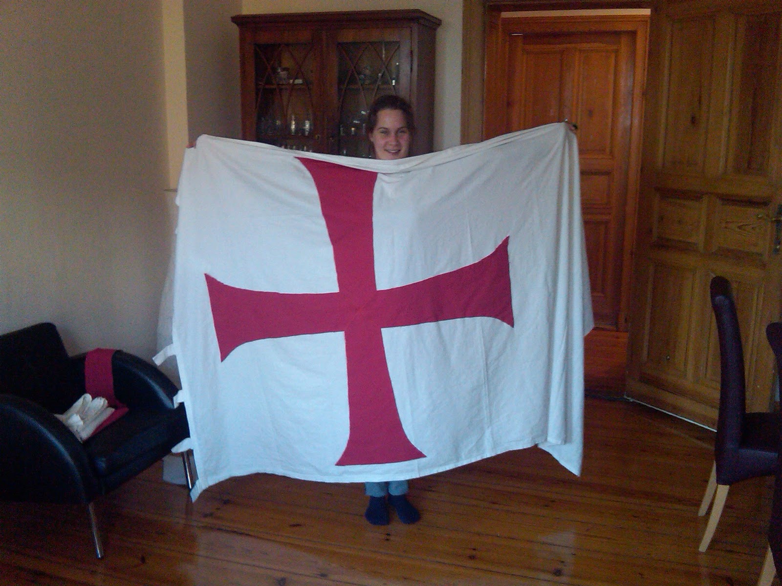 Der Grund dieser Aktion ist das aktuelle Filmprojekt meines Papas, seines Zeichens Filmproduzent. Eine Doku über die Tempelritter mit Reenactment-Szenen. Die Flagge wird am Heck einer schönen alten Hanse-Kogge in Kiel hängen.